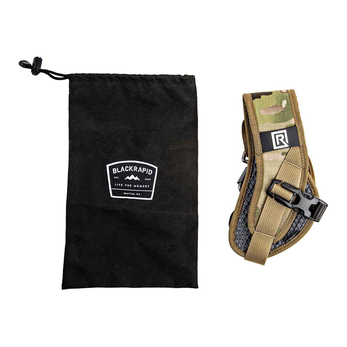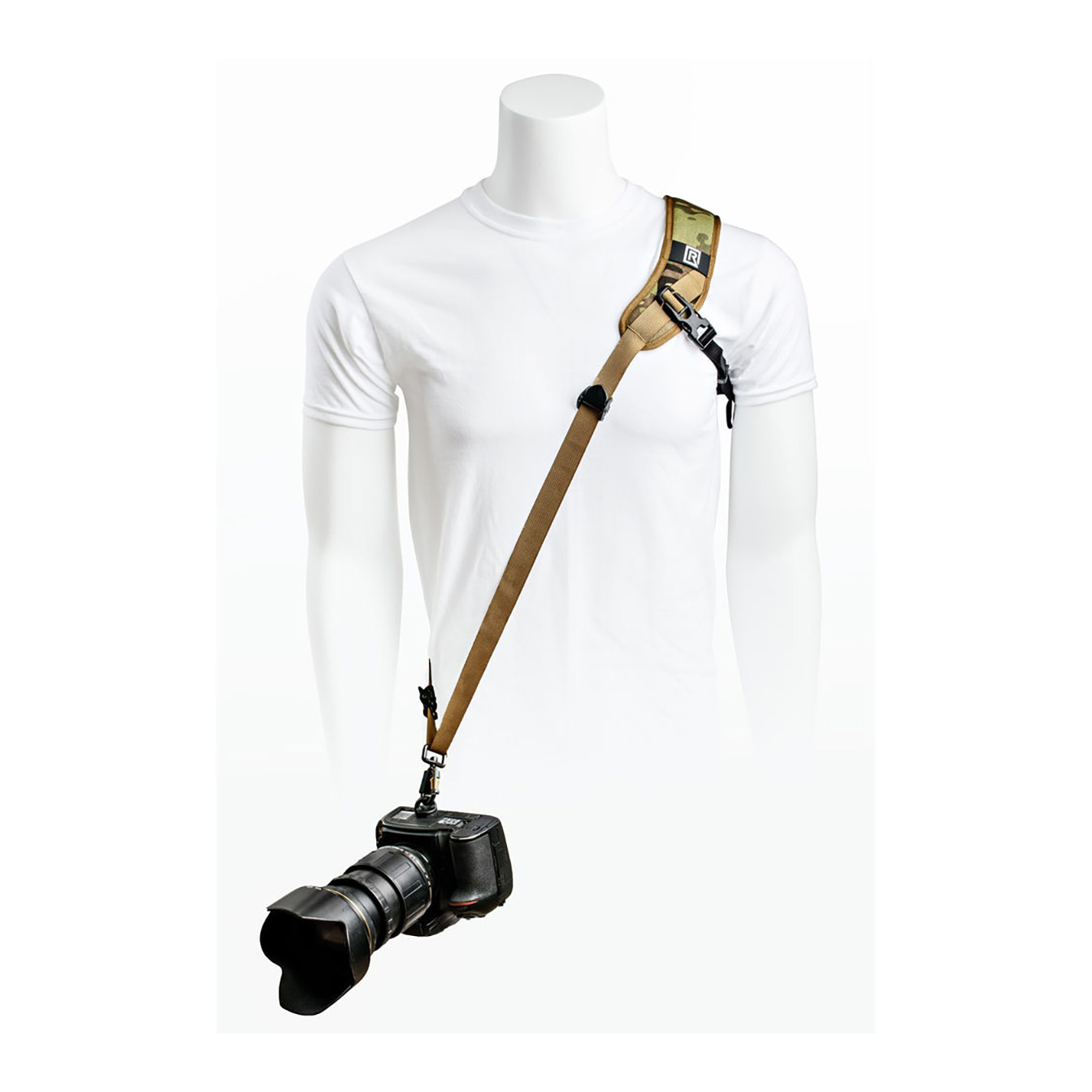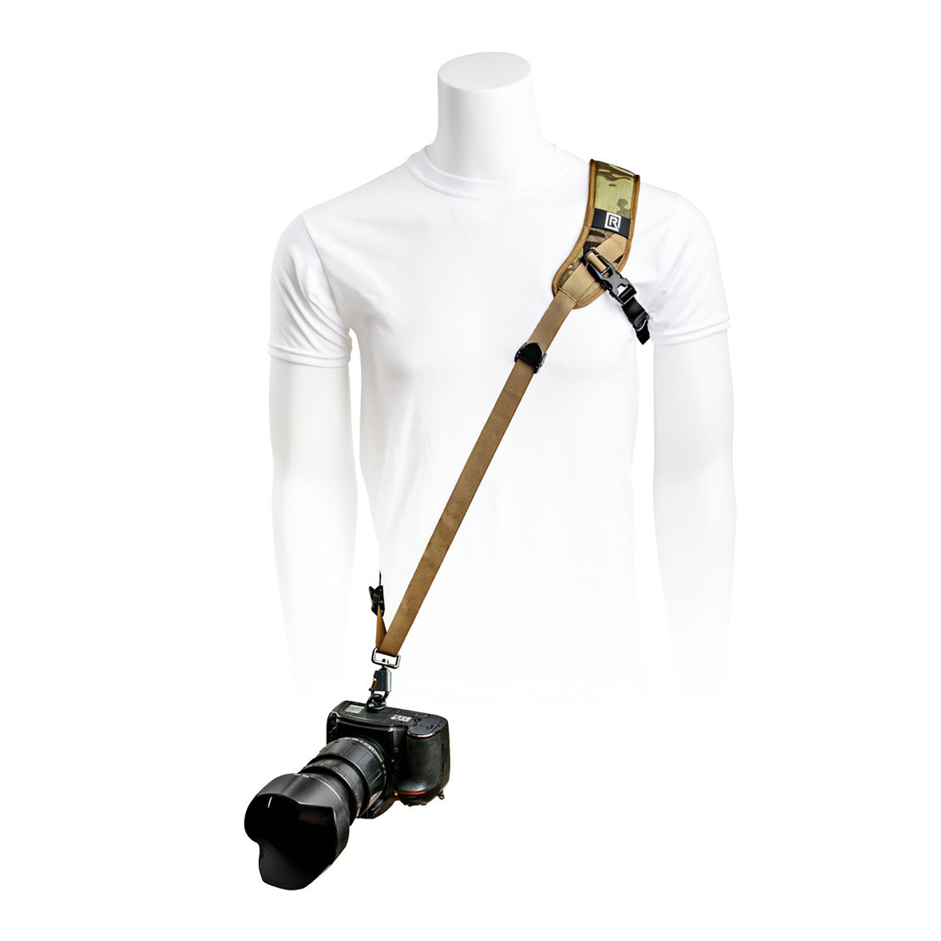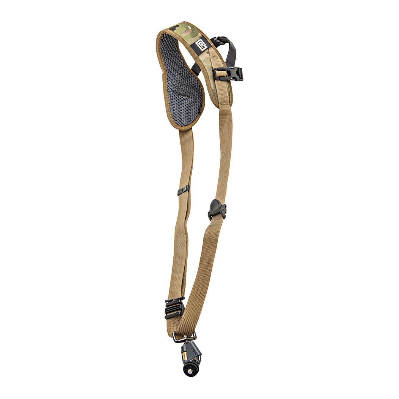Safely and securely carry your camera, and have it ready for fast-paced shooting, with the BlackRapid Sport X Camera Sling Strap in multi-terrain camouflage. This strap is designed for right-handed users, worn across the body from the left shoulder to the right hip. Your connected camera rests upside-down along your hip, allowing you to quickly raise it to shooting position.