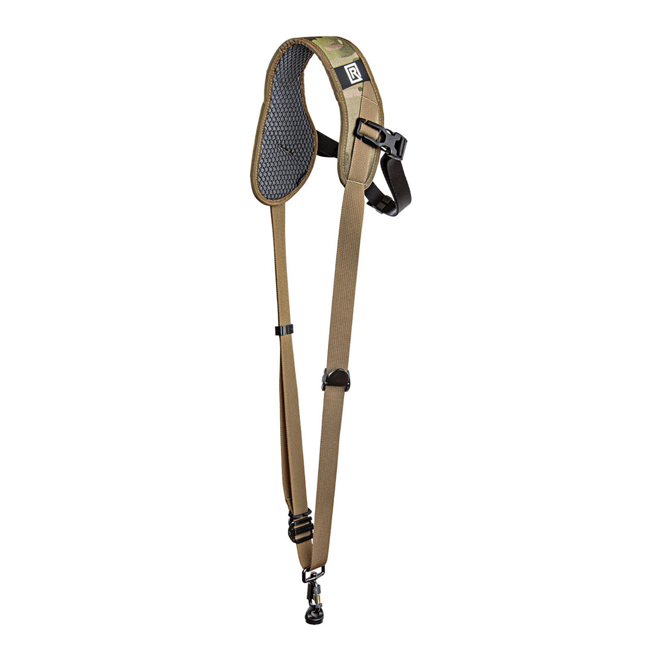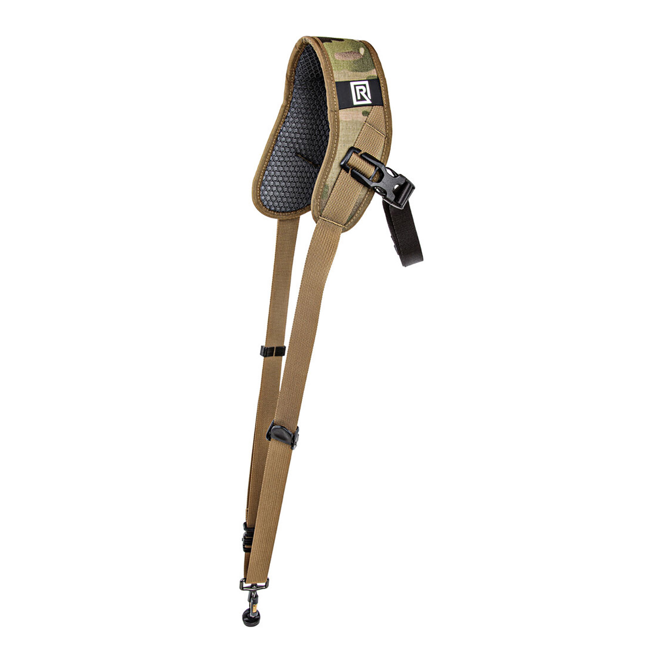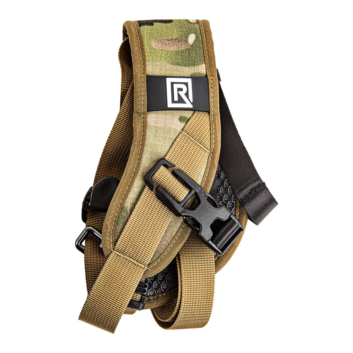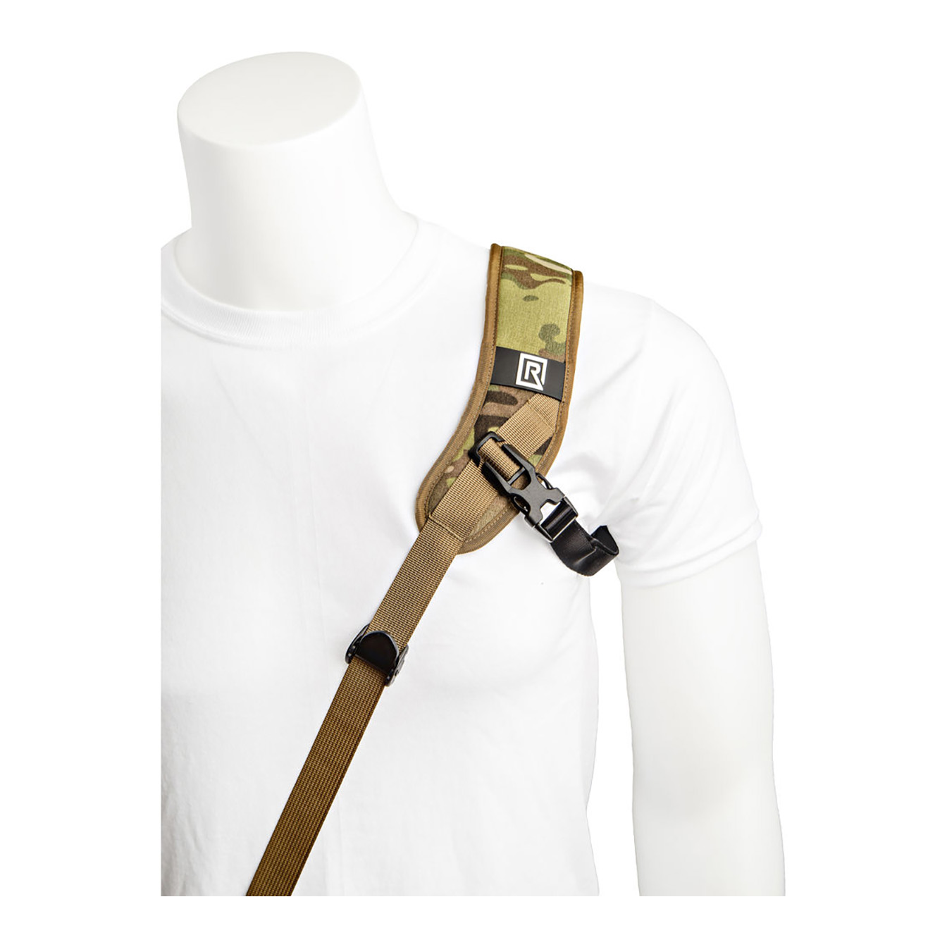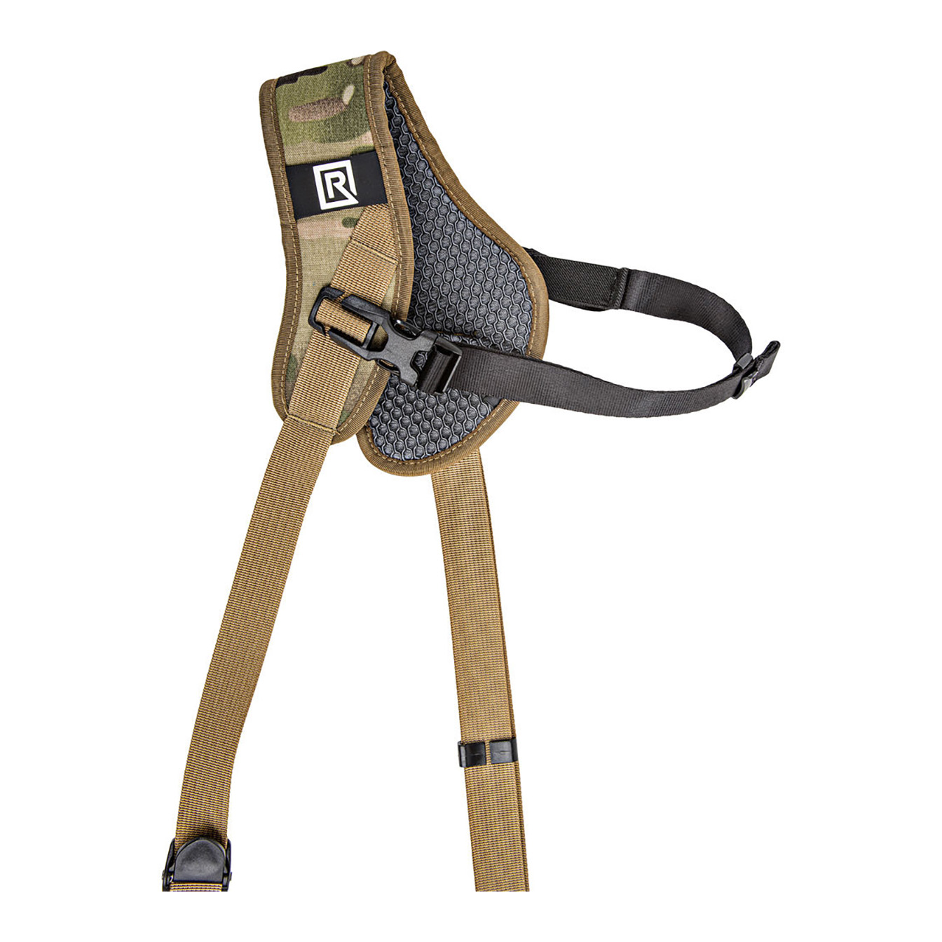 Safely and securely carry your camera, and have it ready for fast-paced shooting, with the BlackRapid Sport X Camera Sling Strap in multi-terrain camouflage. This strap is designed for right-handed users, worn across the body from the left shoulder to the right hip. Your connected camera rests upside-down along your hip, allowing you to quickly raise it to shooting position.