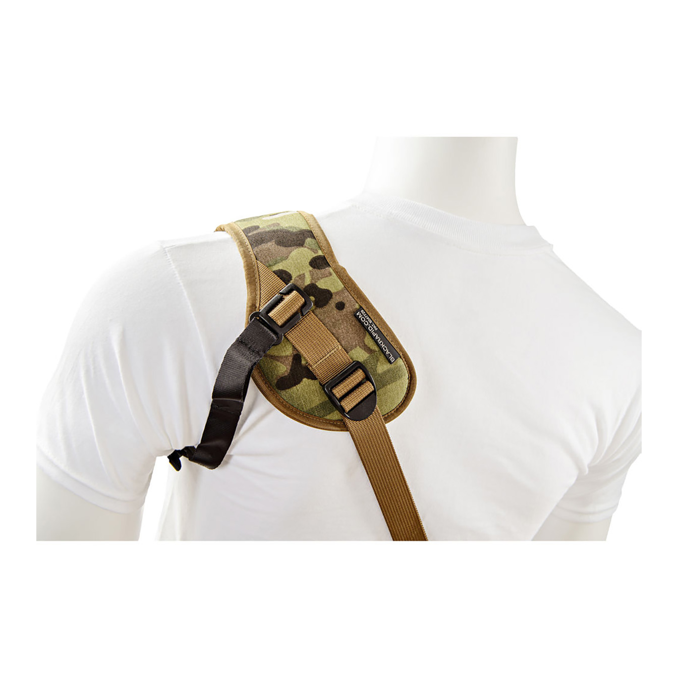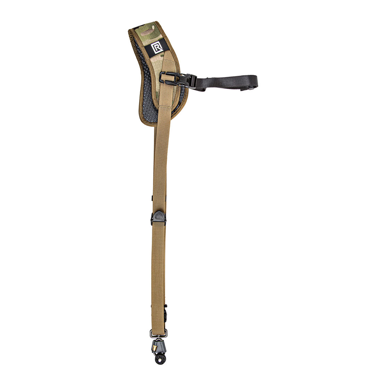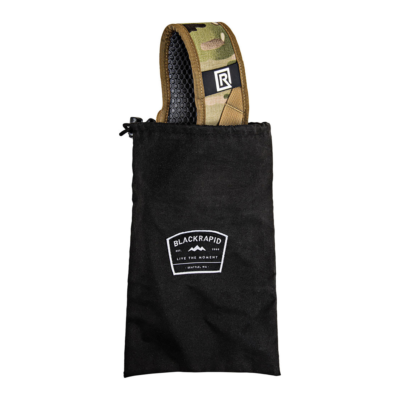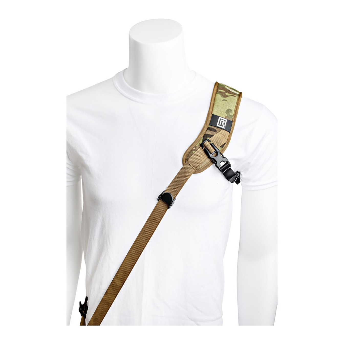 Safely and securely carry your camera, and have it ready for fast-paced shooting, with the BlackRapid Sport X Camera Sling Strap in multi-terrain camouflage. This strap is designed for right-handed users, worn across the body from the left shoulder to the right hip. Your connected camera rests upside-down along your hip, allowing you to quickly raise it to shooting position.