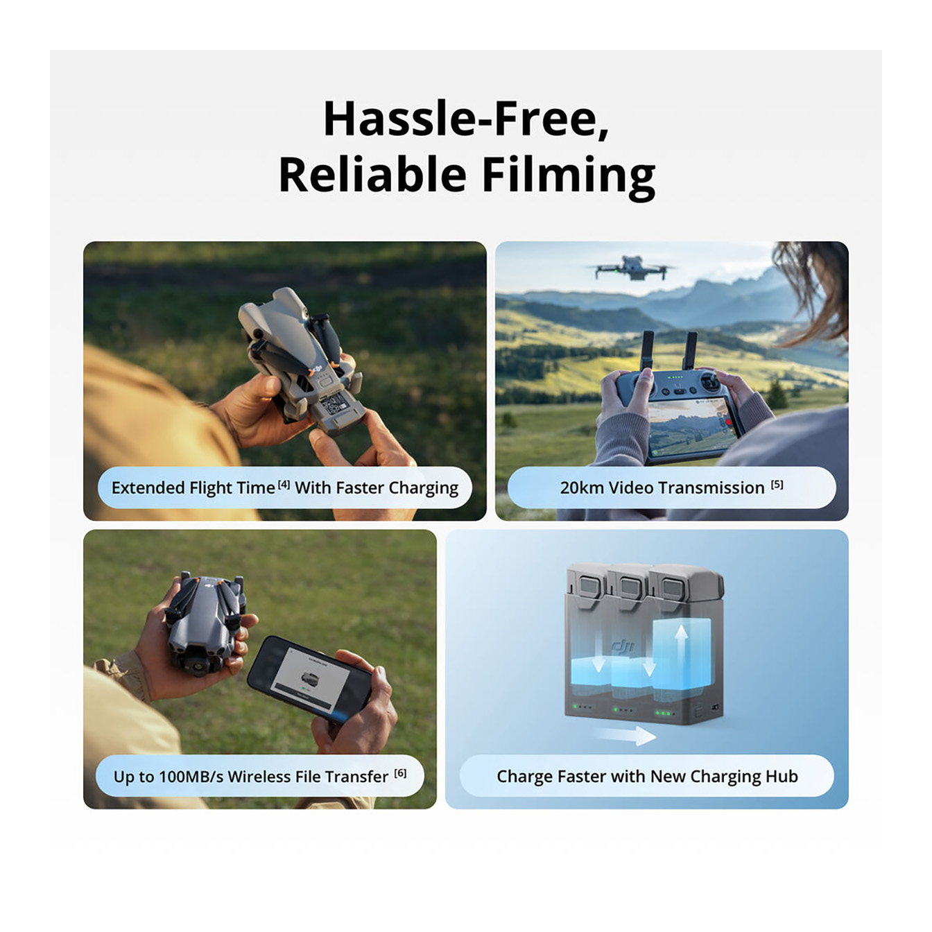 Wi-Fi 6 QuickTransfer: Remotely wake the drone to transfer files to your mobile device at speeds up to 100 MB/s.