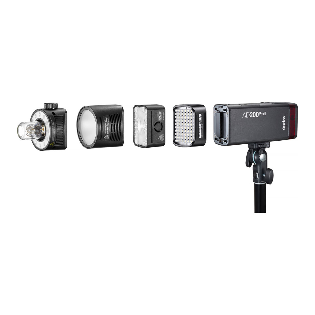The AD200Pro II is part of the **Godox 2.4 GHz wireless X system**, with a **328′ range**, 16 groups, and 32 channels. The **Group Color Indicator** displays different colors for each group, making it easy to manage multiple lights from a distance. For varied lighting, you can swap out the included heads for the **H200R round** or **R200 ring flash heads** (available separately), or use the optional **ADS200 stick flash head** for a **360° beam spread**.