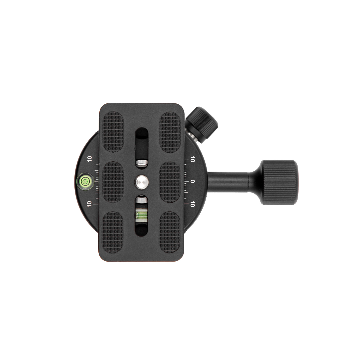 Etched scales on the panning base, QR receiver, and QR plate allow for precise movements and repeatable setups.