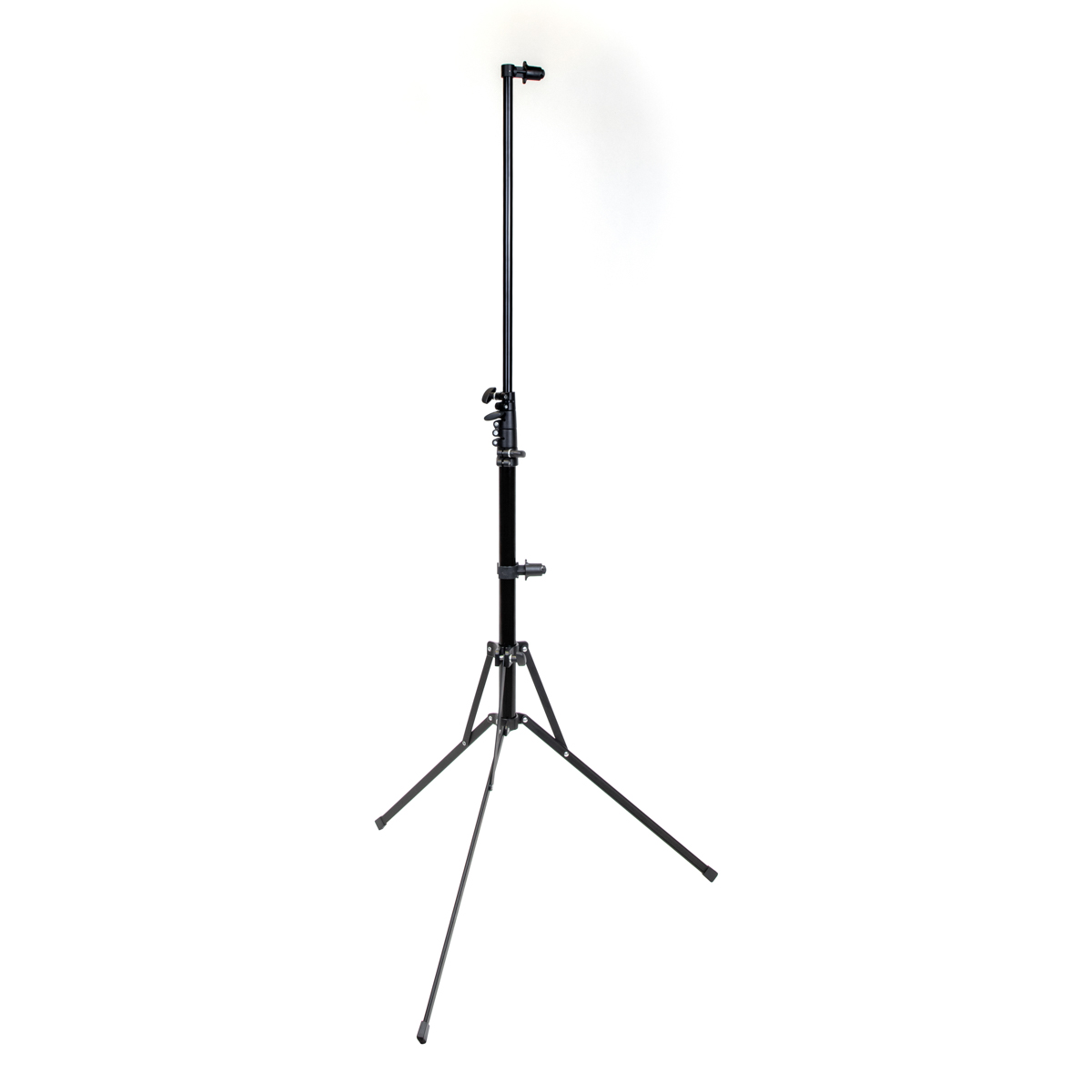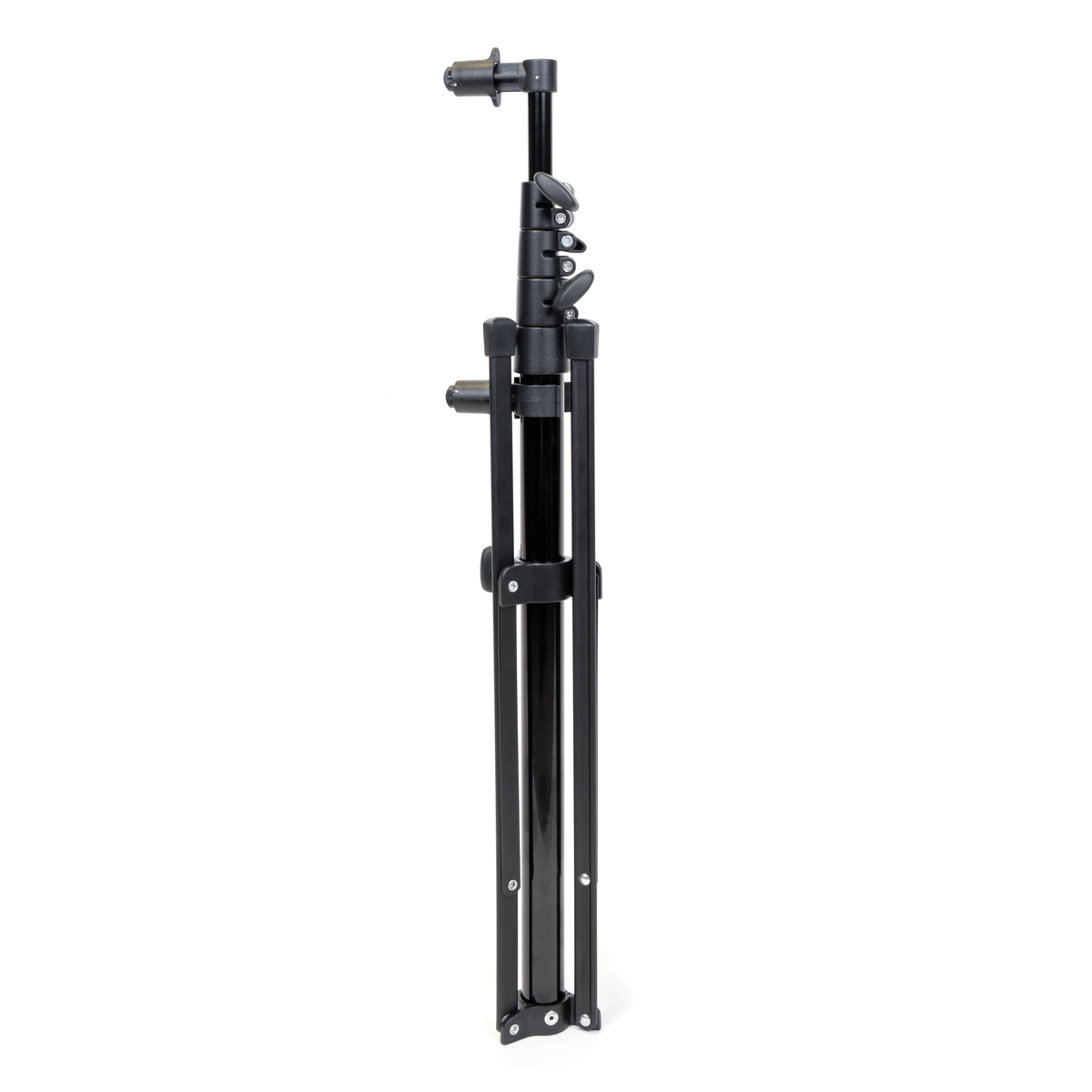 The Pop-up Background and Reflector Stand extends up to 8’ tall. Spring-loaded grips at the top and base of the stand securely hold the internal frame of a pop-up background or reflector.