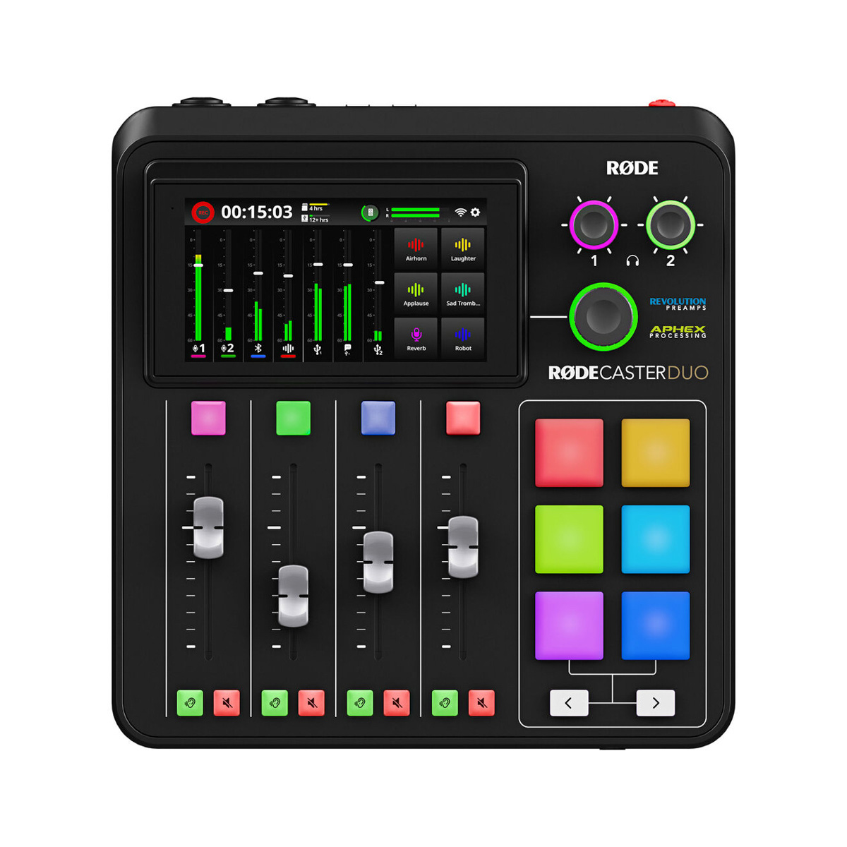 The RODECaster Duo provides intuitive hands-on control with four assignable mixer faders, six customizable SMART pads for audio, FX, and MIDI triggering, a bright touchscreen, and numerous buttons and knobs to create engaging content of almost any kind. Whether you’re a podcaster, streamer, musician, or content creator, the RODECaster Duo is the ideal all-in-one solution for elevating your audio production game.