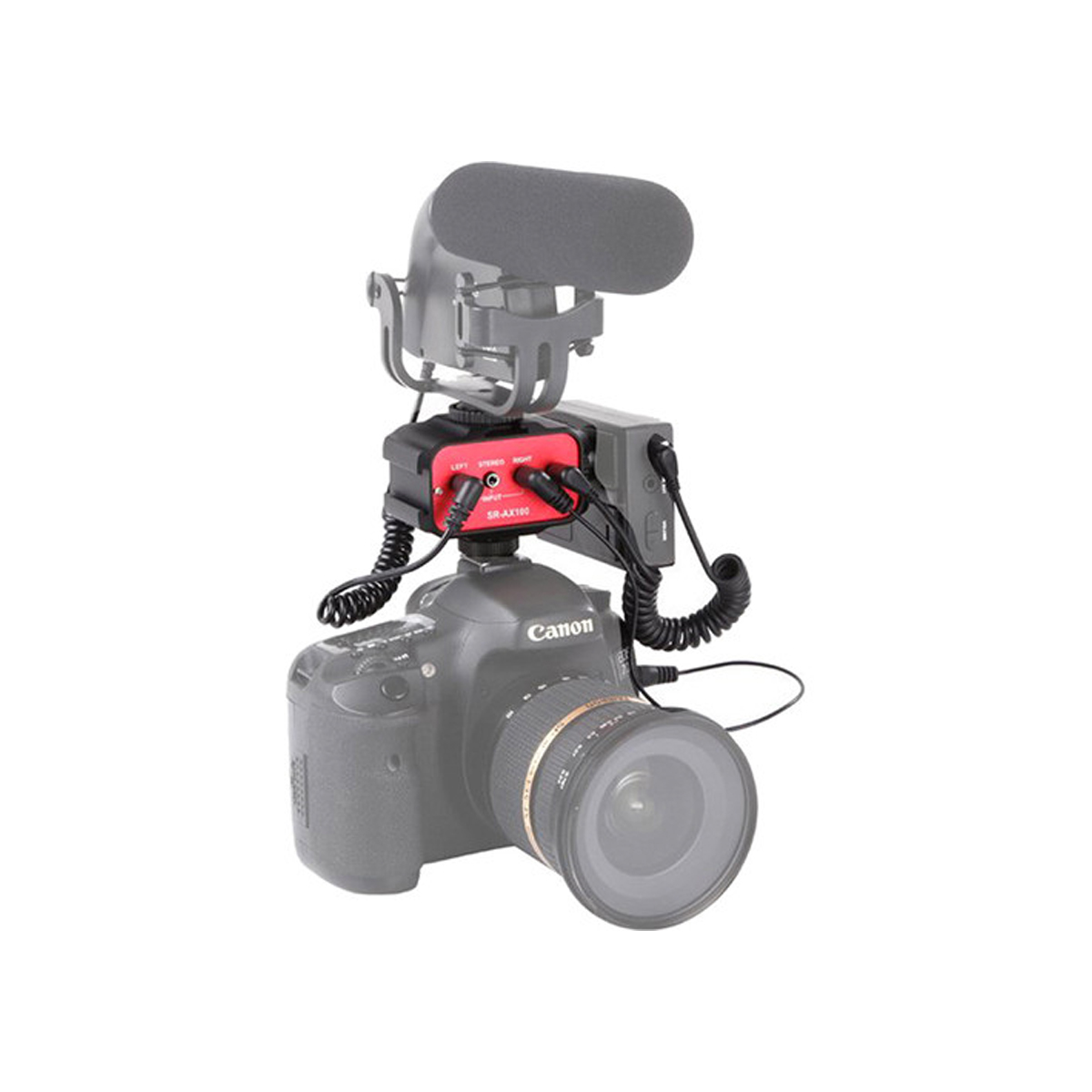 The Saramonic SR-AX100 is an ultra-compact, two-channel audio mixer that makes it possible to connect and mix two microphones to DSLR, mirrorless, and video cameras that only have a single mic input and it doesn’t require power to operate. A built-in shoe mount on the base lets you attach the AX100 to your camera, and a 1/4-20 tripod thread makes it possible to easily attach it to camera cages, tripods and more.