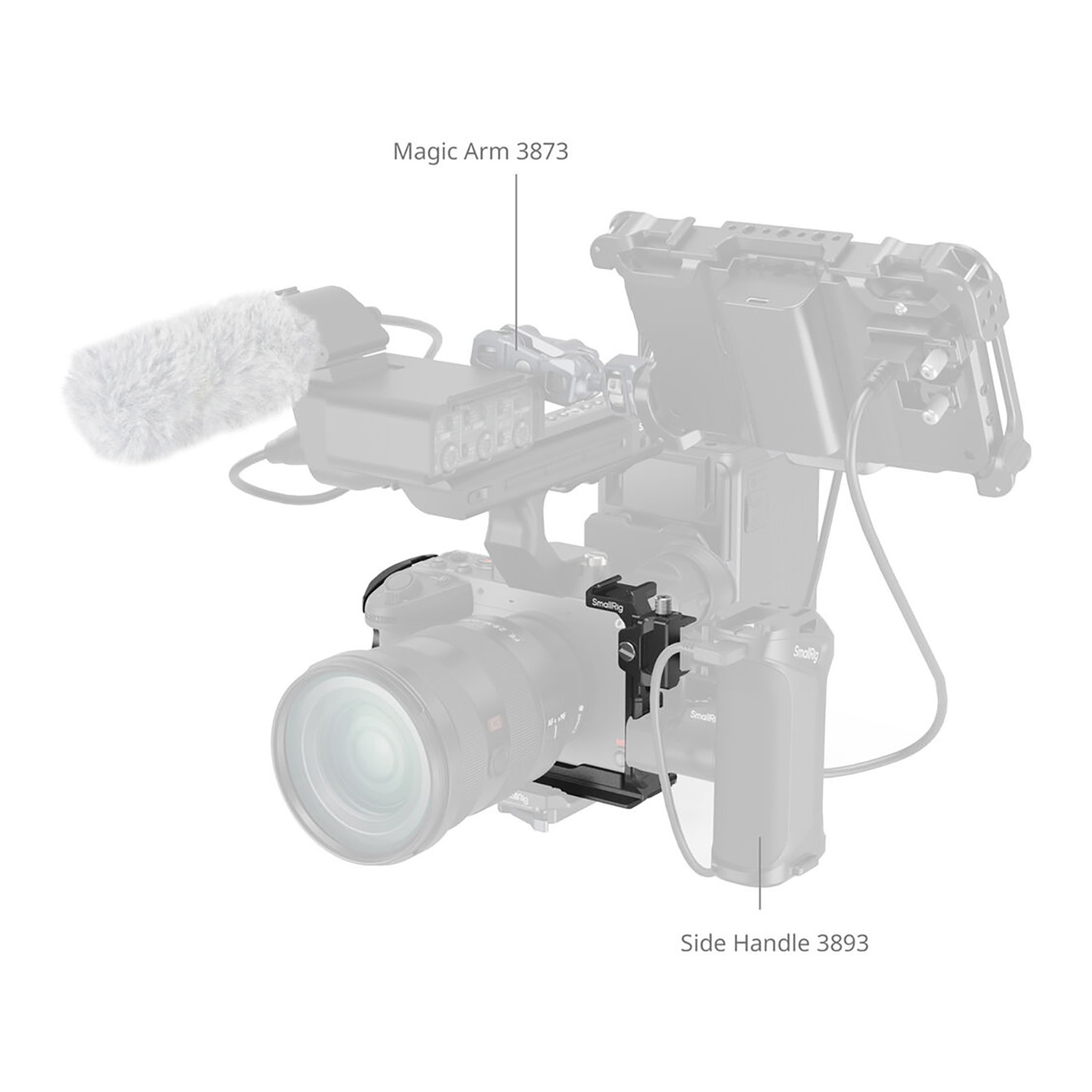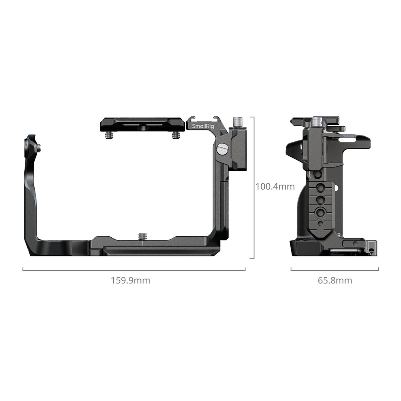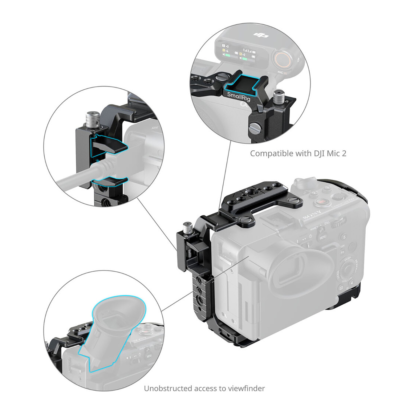 The detachable top plate (included in the kit, and compatible with the standalone cage) boasts a NATO rail, designed to accommodate Sony’s XLR top handle or SmallRig’s rotating top handle (ID 4152) without interfering with the EVF. The cage itself integrates a wealth of mounting points, including: