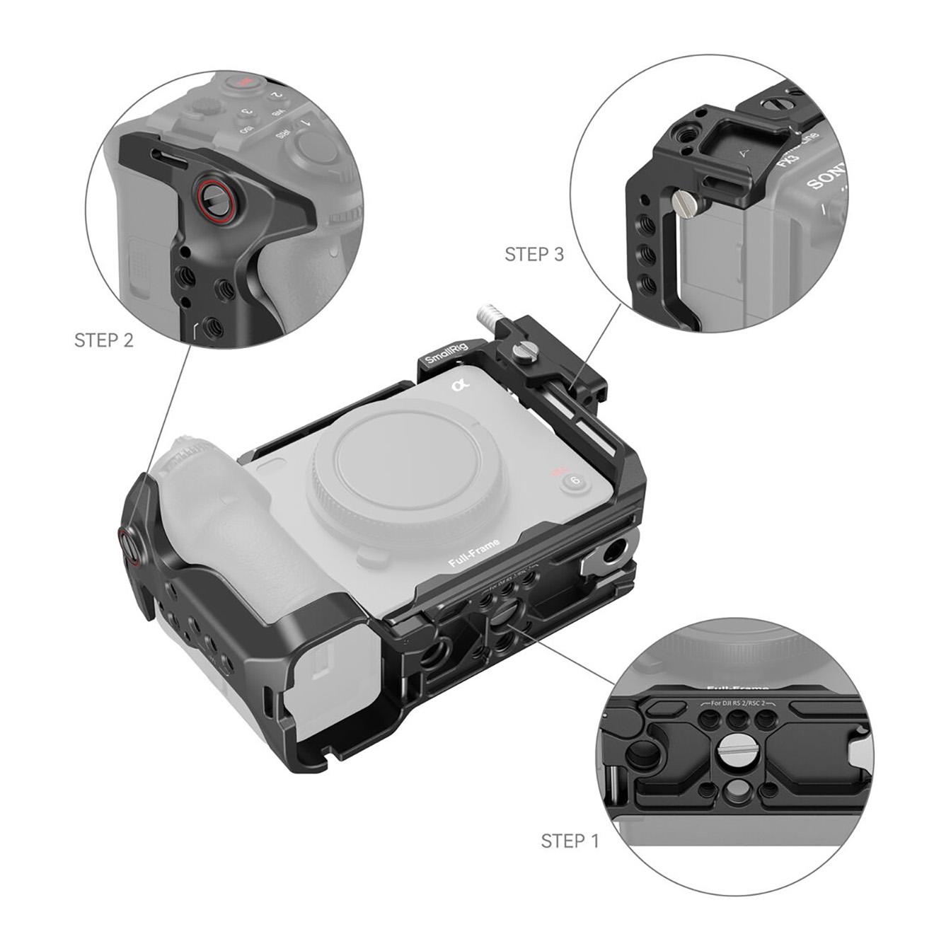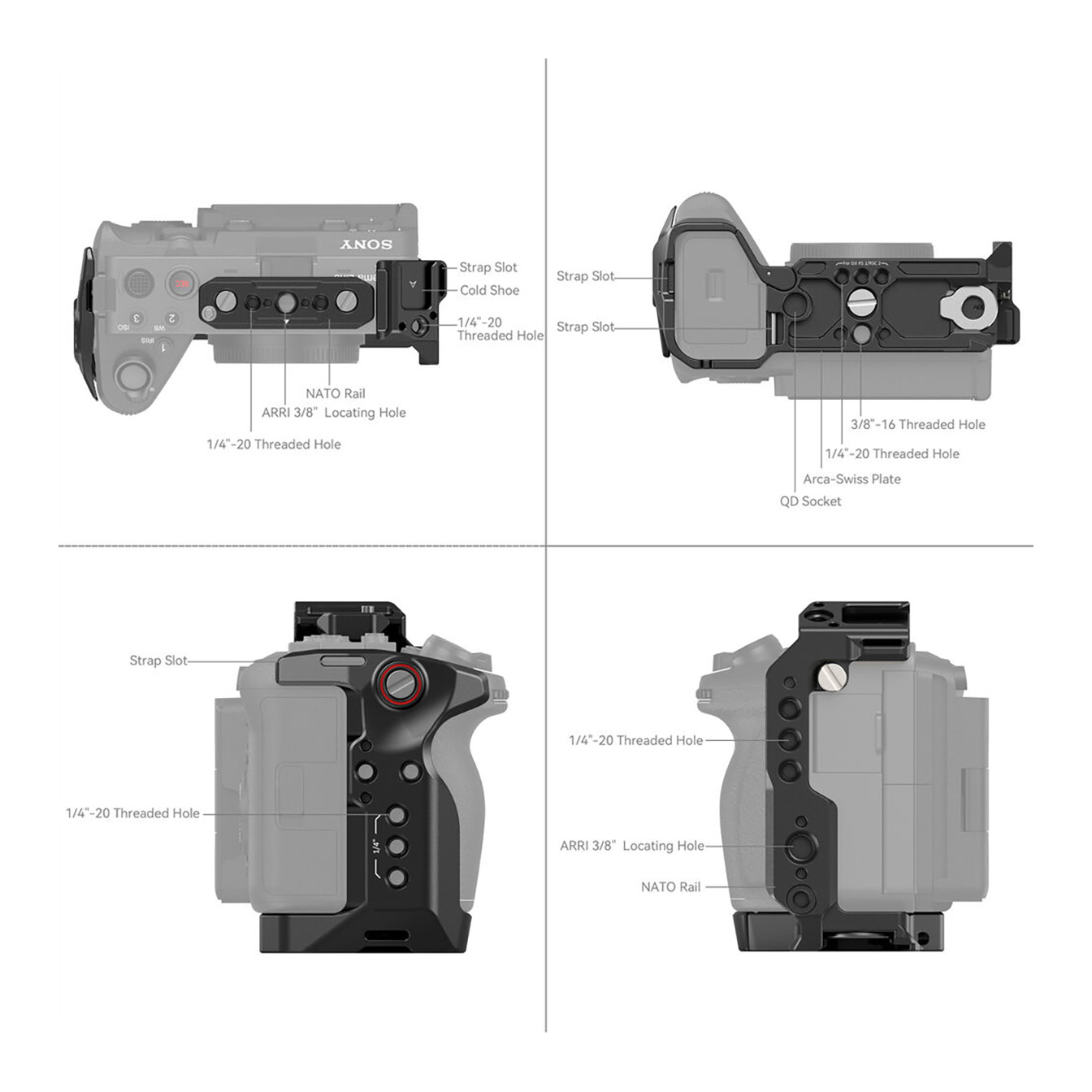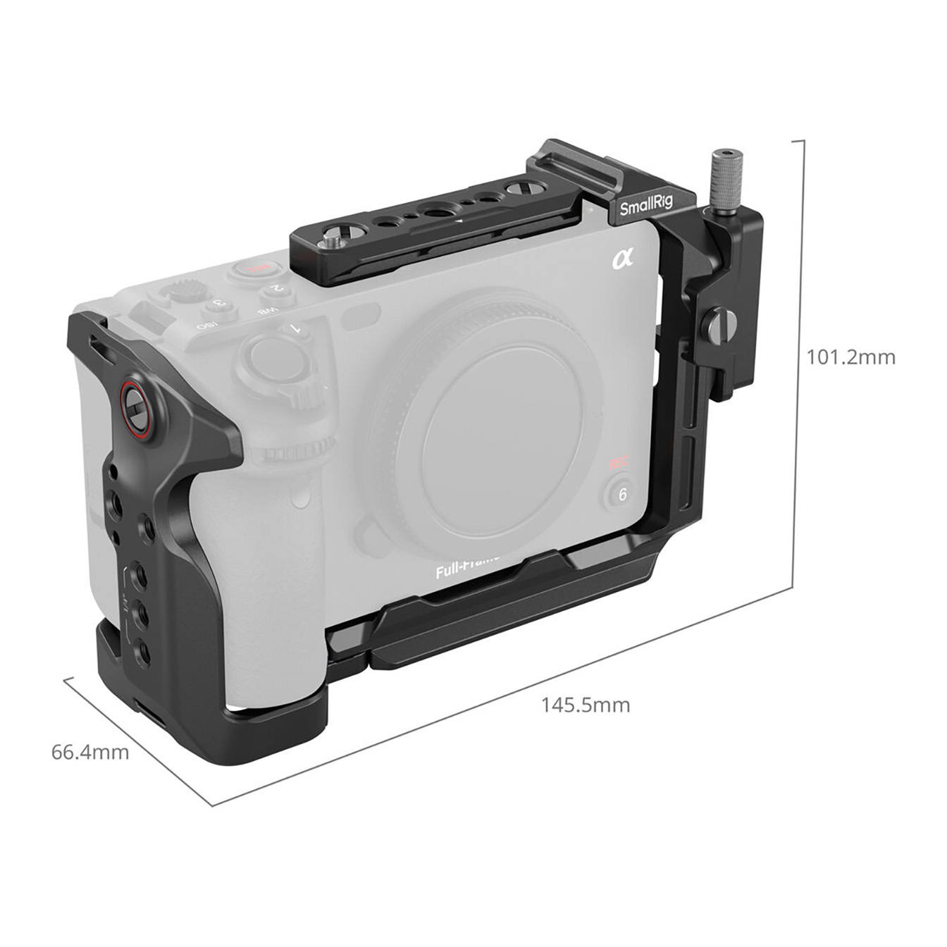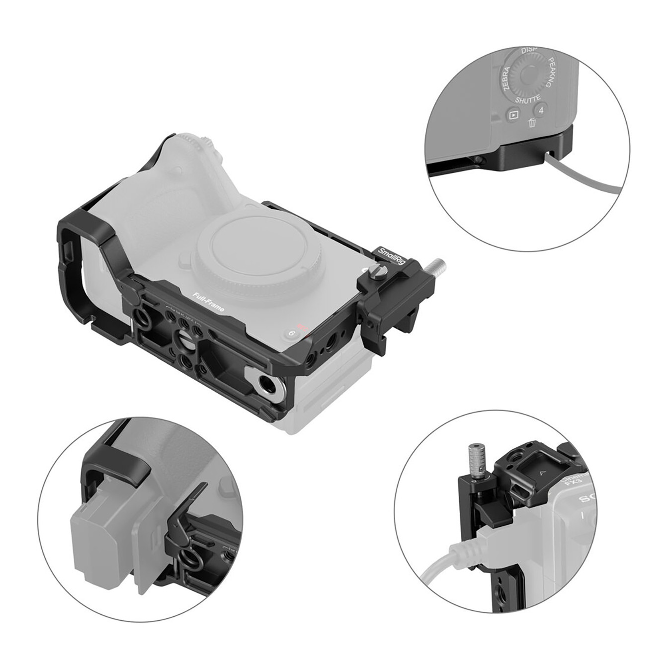 Your camera mounts securely to the cage via 1/4″-20 screws on both the bottom and side, effectively preventing any twisting. Rubber padding on the base further protects your camera from scratches. Crucially, the cage’s precise design ensures full access to all camera controls, buttons, and ports, allowing you to operate your FX3 or FX30 without obstruction.