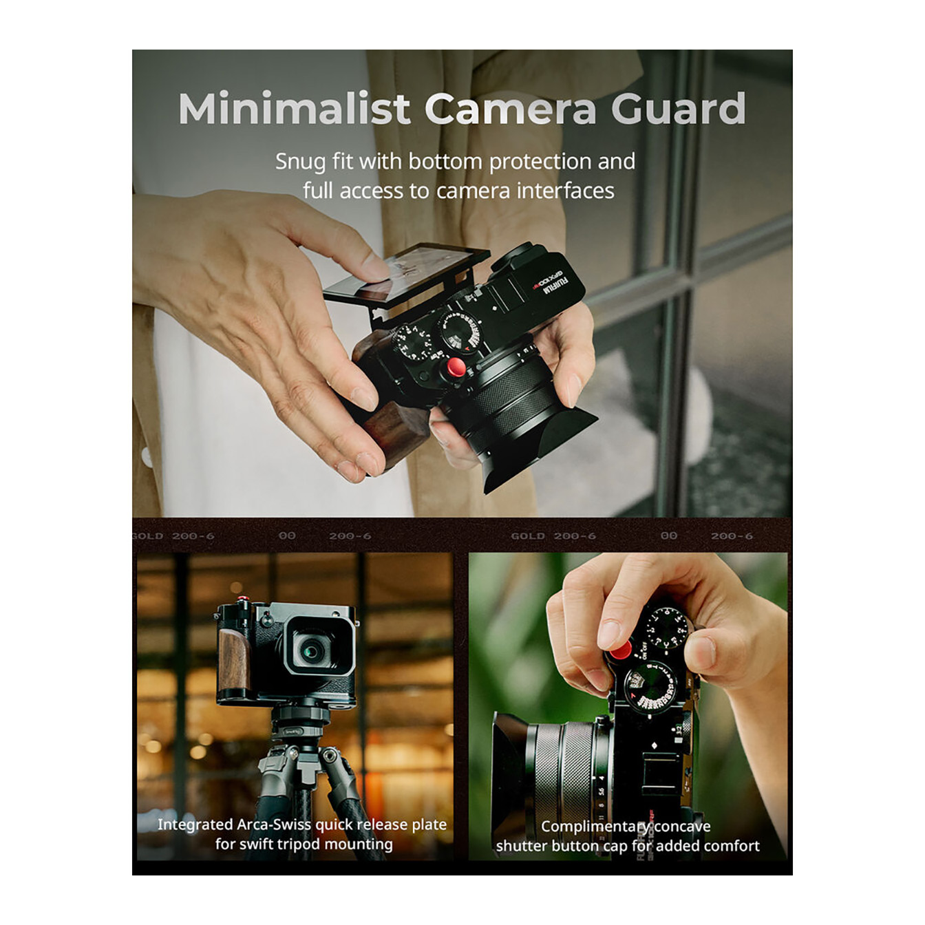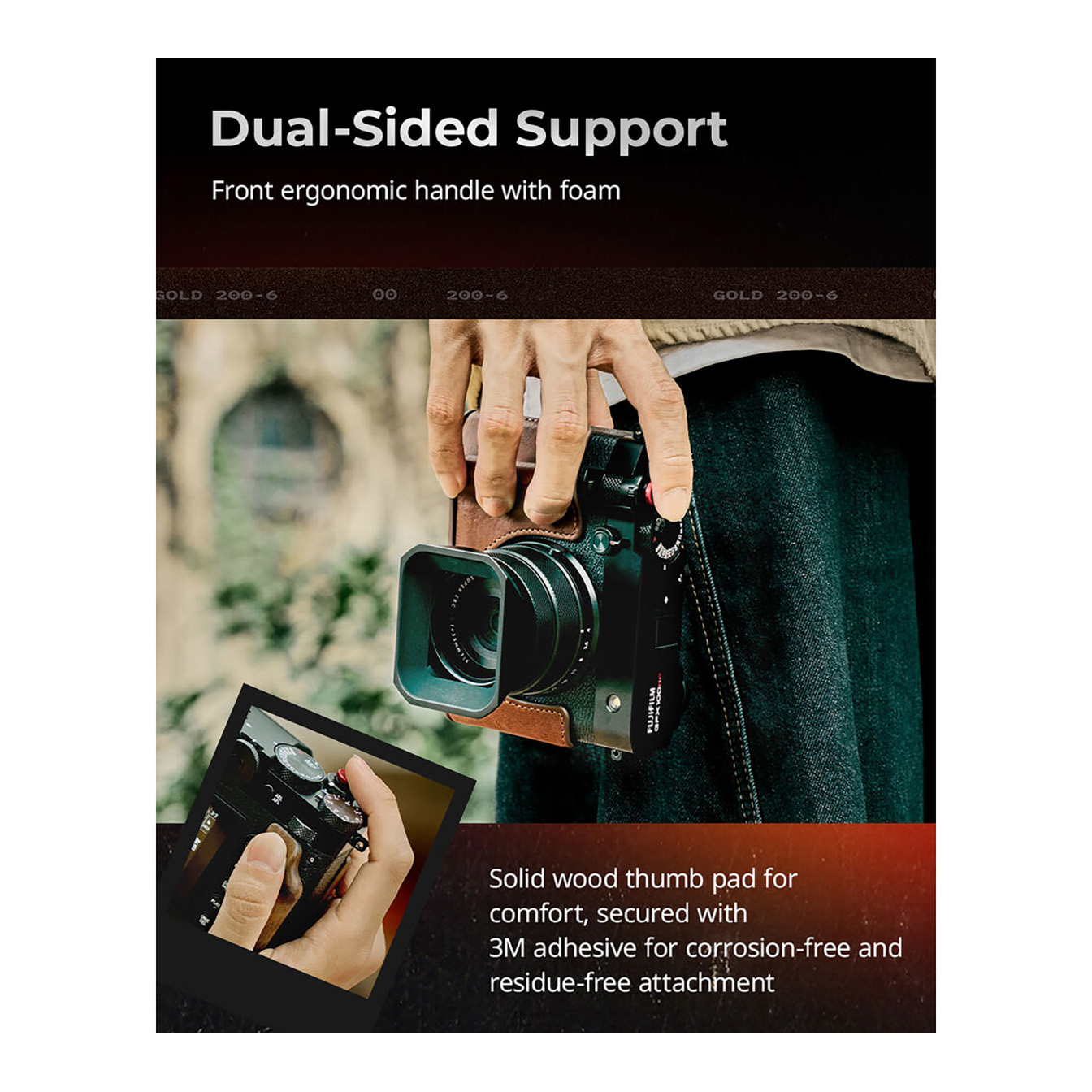 For added security, a dedicated back thumb pad, attached with residue-free 3M adhesive, ensures a firm and confident grip. The integrated arca-type quick release plate allows for rapid and seamless mounting onto compatible tripods, streamlining your workflow between handheld and stabilized shooting.