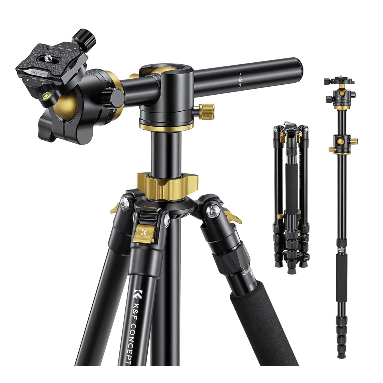 The K&F Concept T255A4+ is a travel-oriented tripod paired with a BH-32L ball head, offered as a complete camera support kit. The tripod legs are constructed from aluminum alloy, providing a balance of stability and manageable carry weight suited to travel and location shooting. Four leg sections fold down to a compact packed length for transport, and twist locks on each section allow for quick and secure height adjustment in the field. The included BH-32L ball head provides smooth and flexible camera positioning across a wide range of angles, with a locking knob to secure the position once the desired framing is achieved. A quick release plate allows the camera to be mounted and detached rapidly without tools. The center column can be inverted for low-angle and macro shooting when needed.