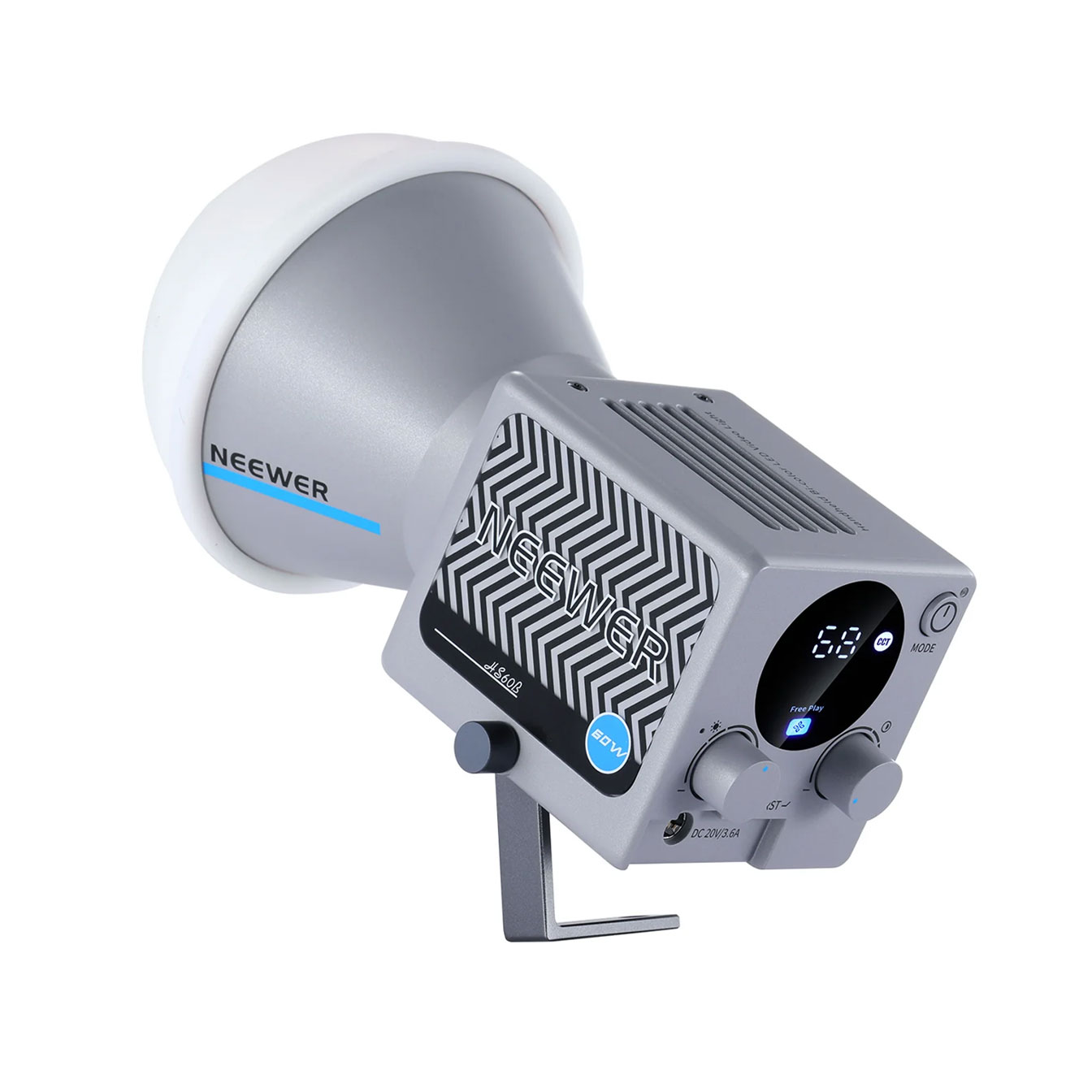 The Neewer HS60B is a compact, portable LED video light offering 60 watts of output in a relatively small form factor. It produces bi-color illumination with a color temperature range adjustable between tungsten and daylight, allowing the light to be tuned to match or complement a variety of ambient lighting conditions without the use of gels. Both brightness and color temperature are continuously variable, giving photographers and videographers precise control over the quality and character of the light output. The light can be powered via AC mains or through a V-mount battery, providing flexibility for both studio use and location work where grid power may not be available. A built-in reflector and optional accessories such as a Bowens-mount adapter expand its light shaping options when used with compatible modifiers. Cooling is handled by a built-in fan system to manage heat during extended use at higher output levels. A versatile and portable option suited to video production, interview setups, content creation, and location photography where a compact but capable continuous light source is needed.