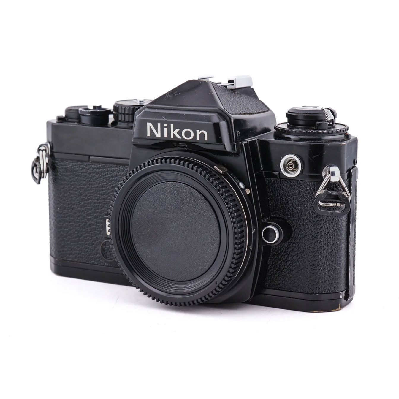 The Nikon FE is a fully featured 35mm SLR camera built around Nikon’s F-mount lens system, offered here as a body-only listing. It offers aperture priority automatic exposure alongside full manual control, with a match-needle metering display visible through the viewfinder to assist with manual exposure setting. The electronically controlled shutter provides a broad range of shutter speeds, and the camera accepts a motor drive or winder accessory for automatic film advance when needed. A center-weighted through-the-lens metering system handles exposure measurement, and the hot shoe and PC sync terminal provide compatibility with a range of external flash options. The all-metal construction reflects the build standards of Nikon’s professional and enthusiast film SLR lineup of its era. Compatible with the full range of Nikon F-mount lenses spanning AI, AI-S, AF, and AF-S specifications, providing access to an exceptionally broad lens ecosystem across both film and digital Nikon bodies.